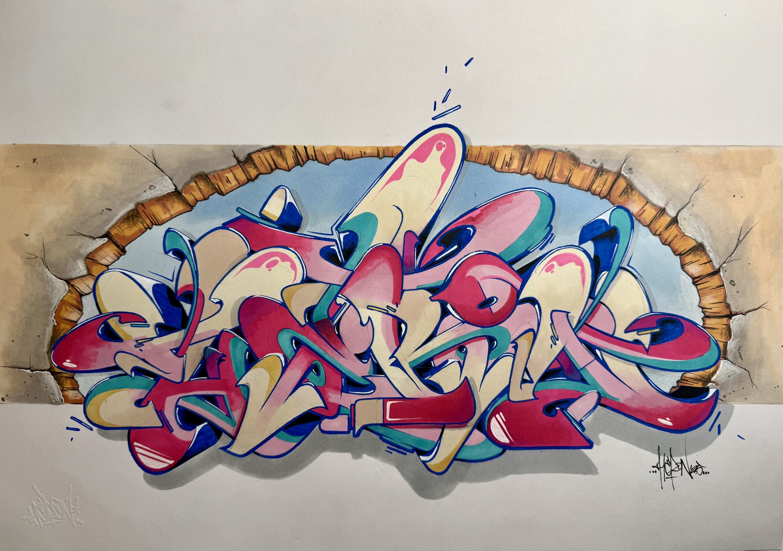 The Wall 2025 is a vibrant and dynamic sketch created by Theron in 2025, crafted with a blend of alcohol markers and acrylic markers. The artwork bursts through its stone-textured backdrop, transforming the surface into an explosion of fluid shapes, bold color transitions, and expressive movement.